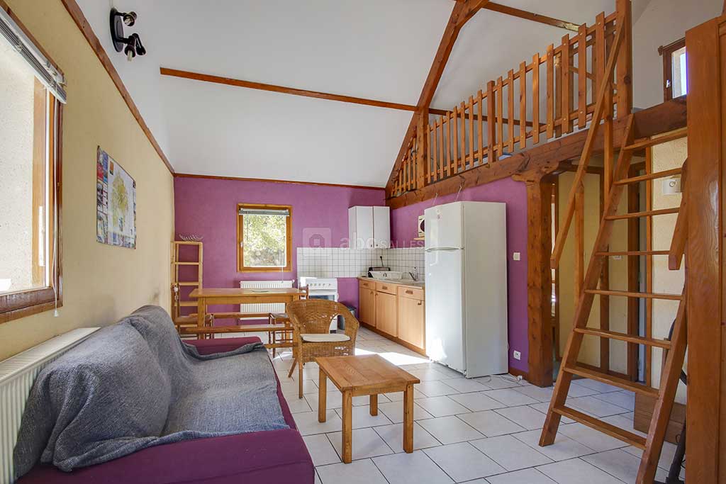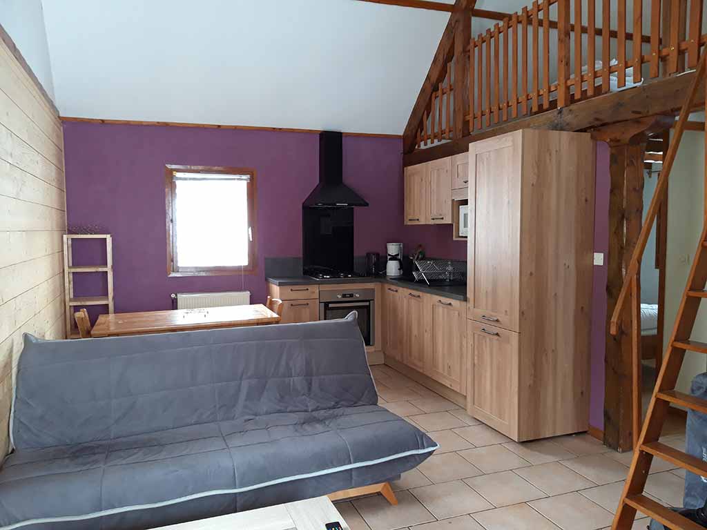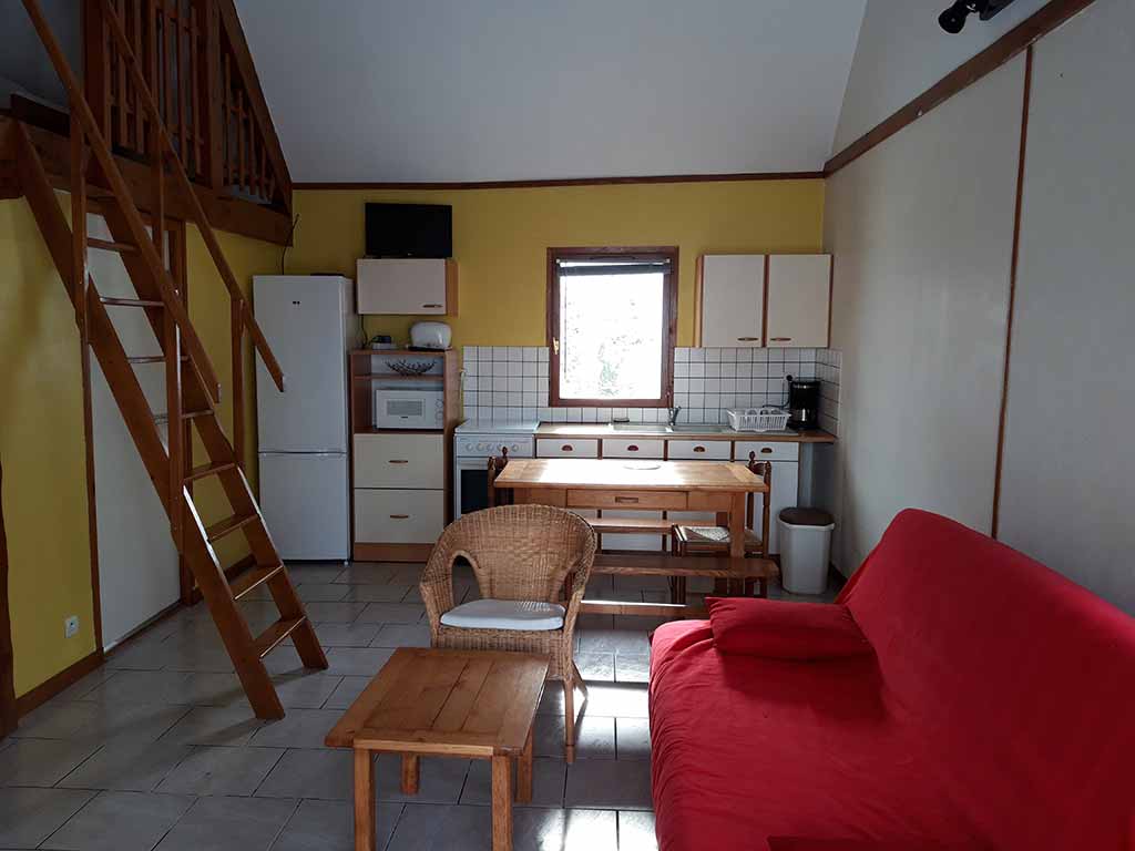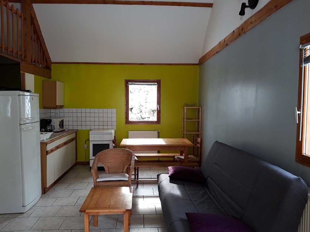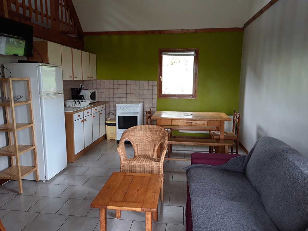 - Pièce de vie comprenant un coin repas, un canapé, une cuisine.
