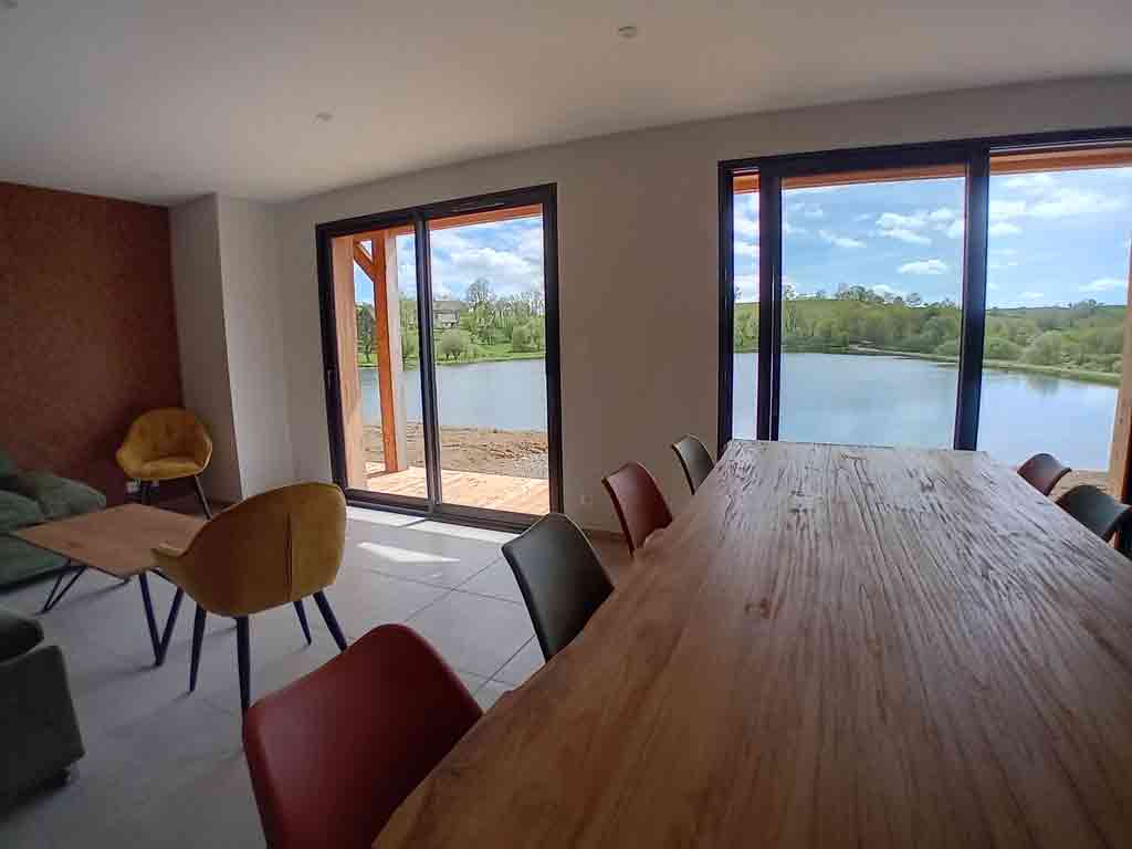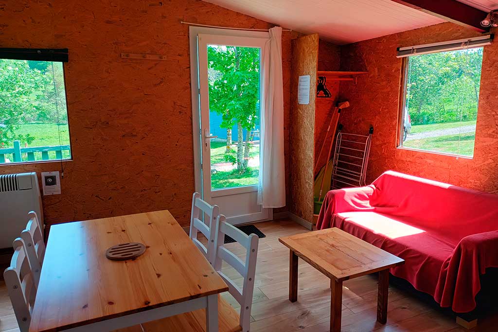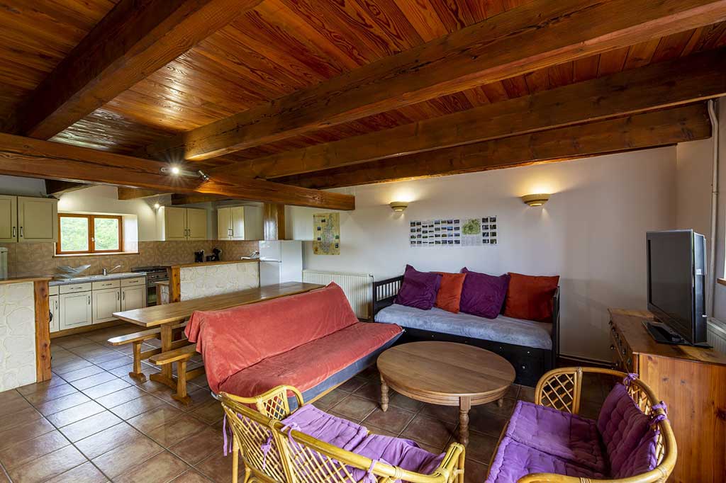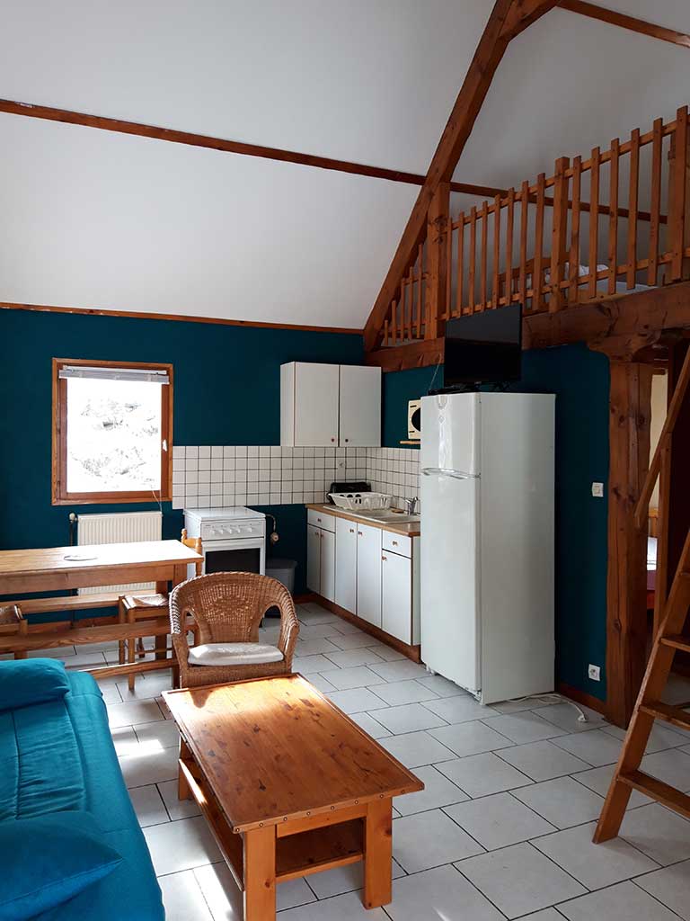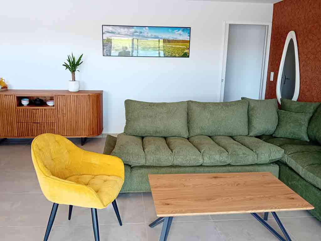 - Pièce de vie comprenant un coin repas, un canapé, une cuisine.